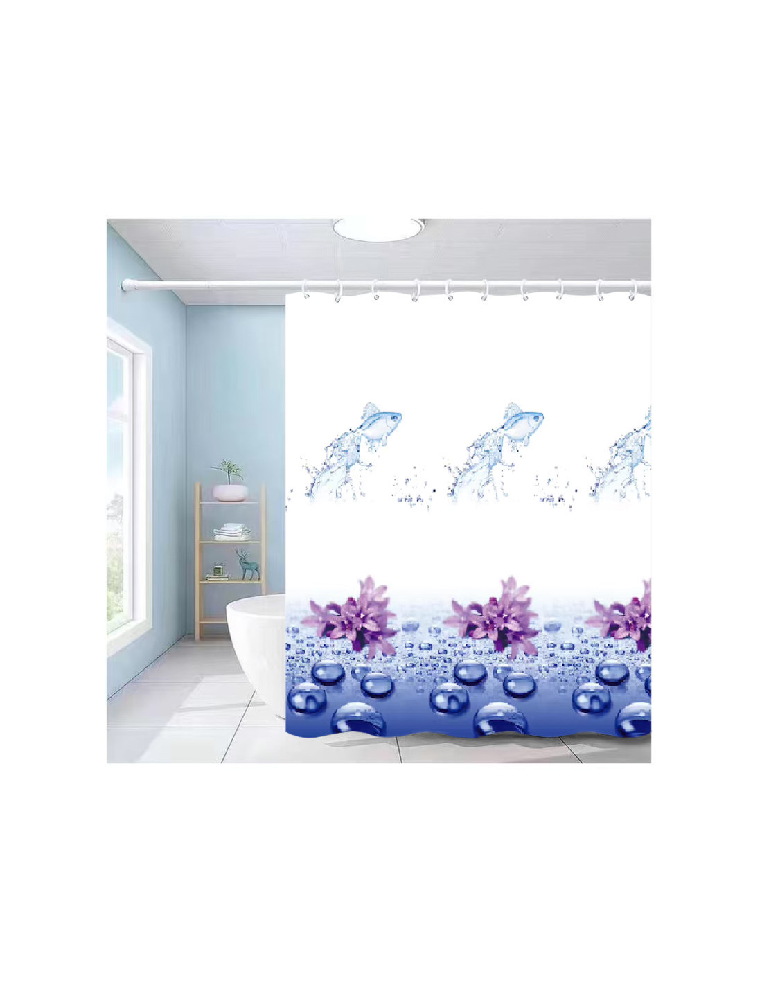 Model: Blue Water (picaturi 3D, flori albastre-roz, fundal alb)